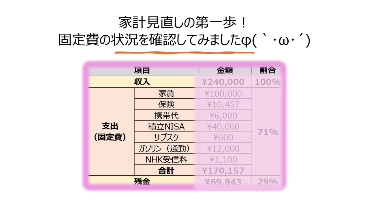 わかったことが給料の7割が固定費で消えているということ。